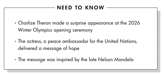 In February 2026, Theron made a surprise appearance at the opening ceremony of the Winter Olympics in Milan. As a United Nations Messenger of Peace, she delivered an emotional address calling for unity and understanding, quoting the words of South African icon Nelson Mandela. Her speech served as a reminder of her advocacy work and global influence beyond acting.